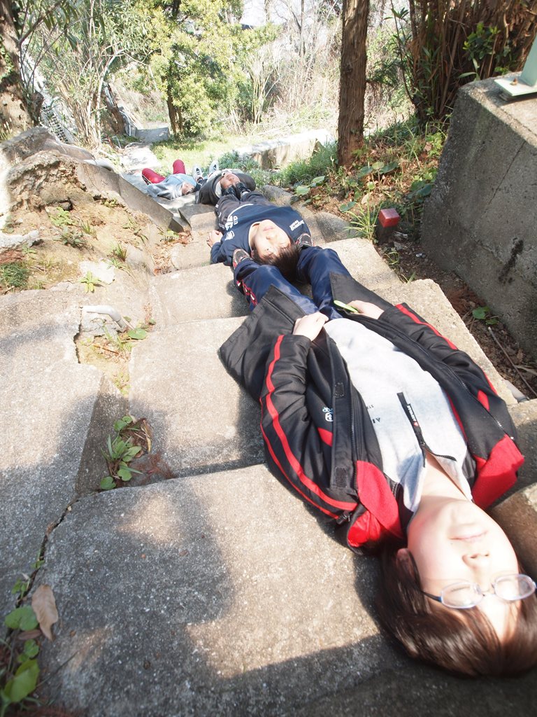 卒業旅行生たちが、海岸で、穏やかな日差しの中、だらだらと気持ちよさそうに寝そべっています。