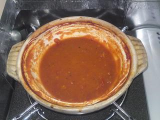 一人用の小さな土鍋に缶詰トマトを一缶→すでに土鍋が一杯
