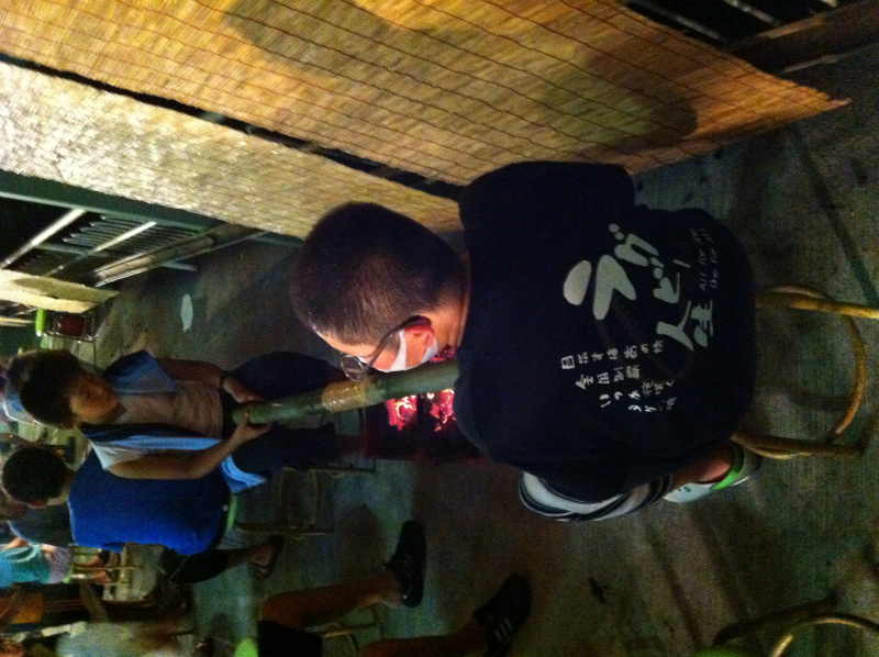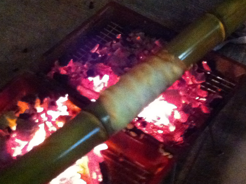 バウムクーヘンの「芯」として切り出してきたばかりの竹を使い、しかも炭火で焼こうという壮大なイベントです。