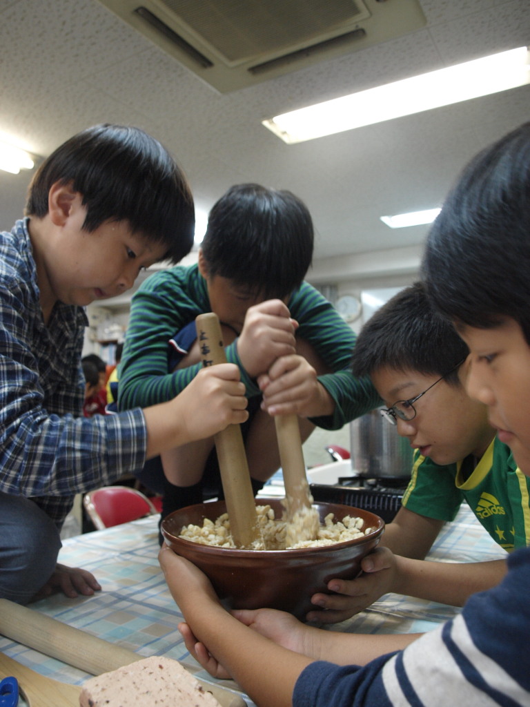 僕 : すり鉢とすりこぎで大豆を40分間すりつぶします。