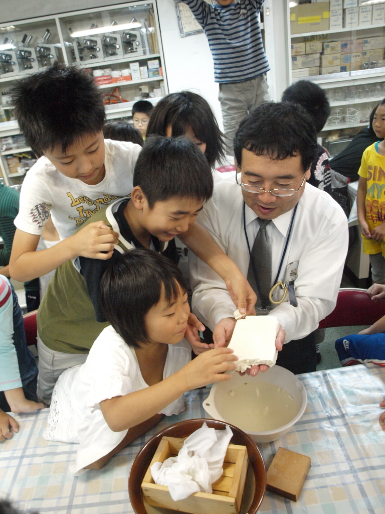 僕 : 水を入れてかき混ぜ、布でしぼると豆乳が取れます。