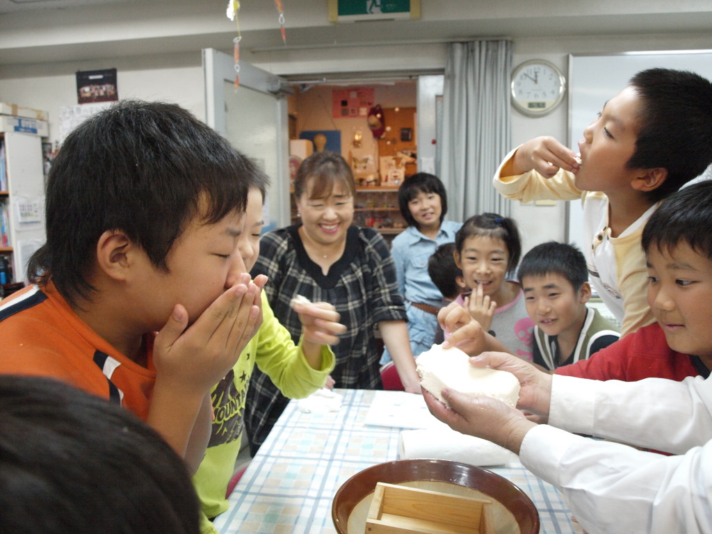 いくつかの工程を経て、無事できあがった湯気立ち上るお豆腐を、子どもたちは手でちぎり取って頬張る。