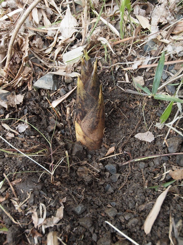 星くずの村の石階段をせっせと上り、竹やぶに入っていくと土の中からたくさんのタケノコが顔を出しています。