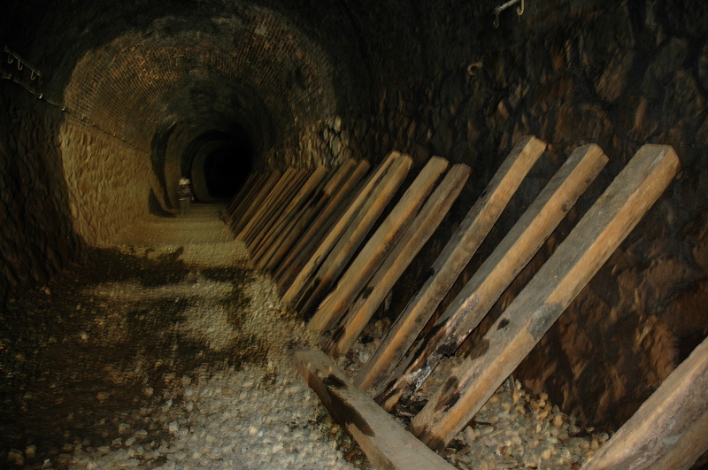 かりを頼りに小刻みな歩幅で歩かざるをえない。トンネル内に滴る水の音が小さく反響を生んで