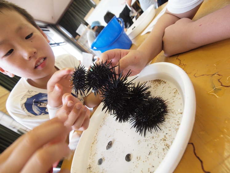 中1、2が電子工作をしている間、他の学年は、海辺まで磯の生物を採取し、