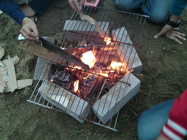 砂場に穴を掘り、枯れ草を入れ、紙を入れ、点火する。