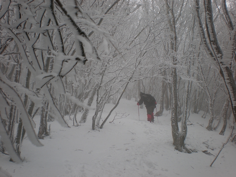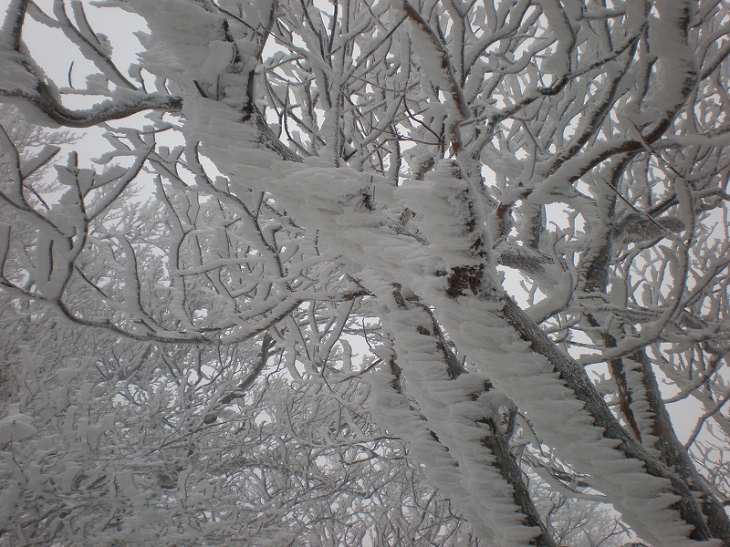 頂上へ続く稜線付近のブナの枝々に、今年も霧氷は美しく、